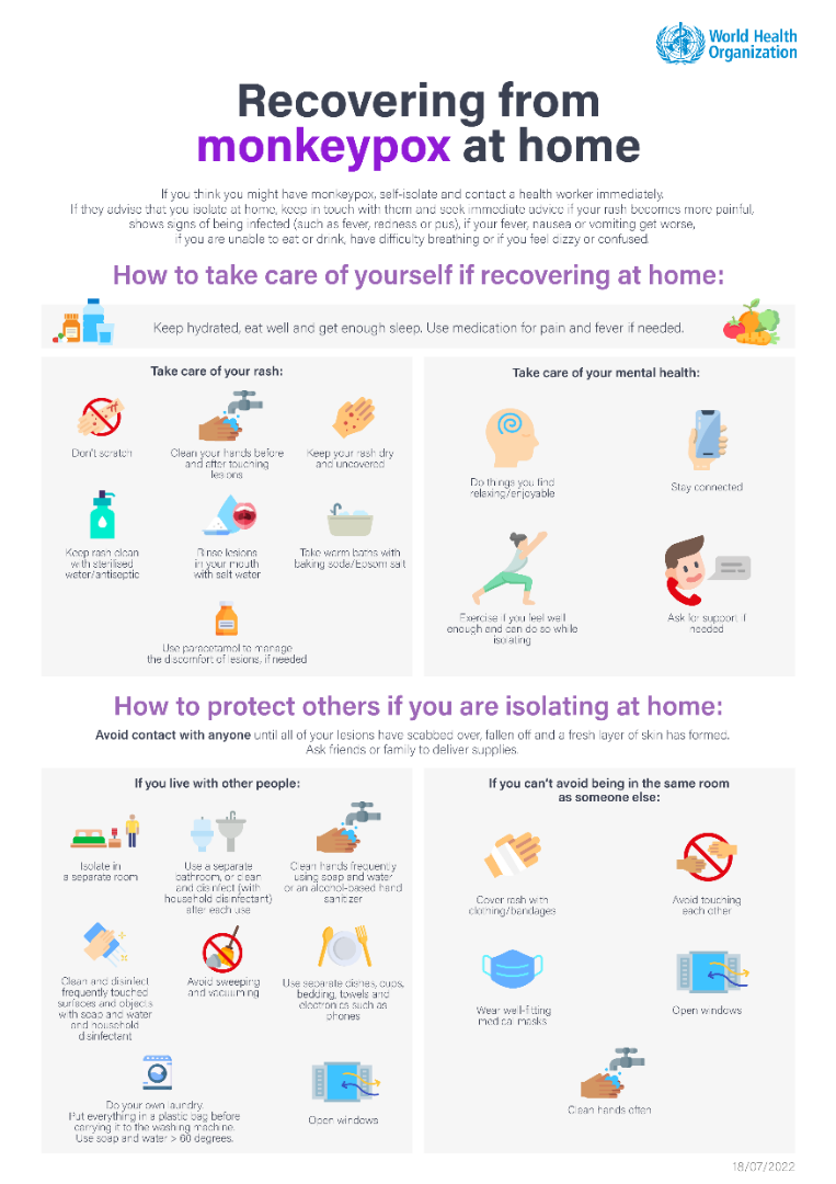 मंकीपॉक्स तब तक फैल सकता है जब लक्षण शुरू हो जाते हैं जब तक कि दाने ठीक नहीं हो जाते हैं, सभी पपड़ी गिर जाती है, और त्वचा की एक नई परत बन जाती है। रोग आमतौर पर 2-4 सप्ताह तक रहता है।